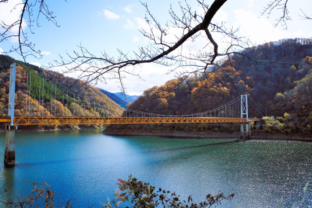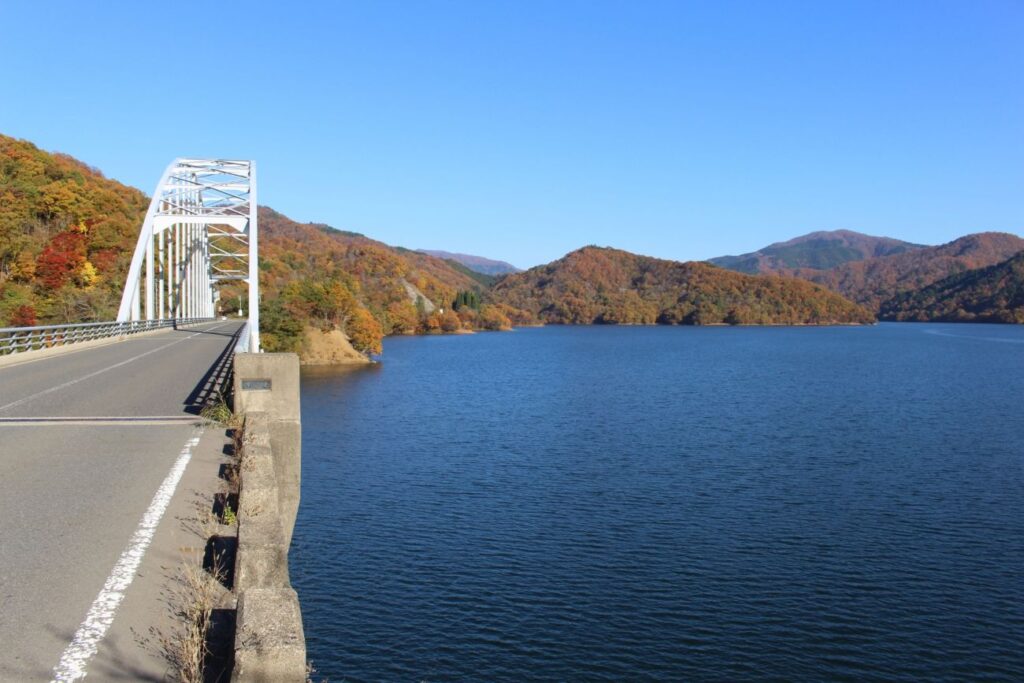 橋の上から眺める九頭竜湖と周辺の紅葉はまさに絶景。「夢のかけはし」という愛称がついたのも納得できる、美い景色が楽しめます。
