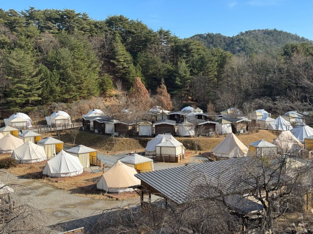 歩道橋から見えるモンゴルのゲルのようなものは、グランピングエリア「GRAX」のテント。公式サイトを見てみると、BBQも楽しめるようなので、温泉+BBQ+グランピングという欲張りセットな体験ができそうです。