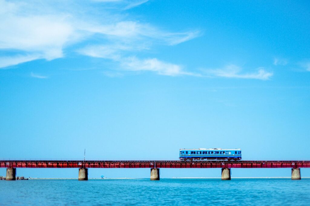 立ち寄りスポットはいくつかありますが、個人的におすすめしたいのが車で約30分のところにある由良川橋梁です。由良川橋梁は、由良川の河口にかかる、京都丹後鉄道が走る鉄橋です。